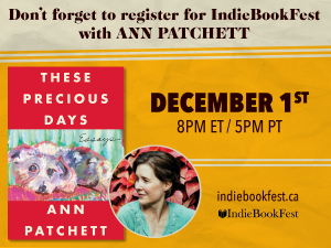IndieBookFest via HarperCollinsCanada are hosting an event with Ann Patchett. Ann will be talking about her new book of essays, These Precious Days. When: Wednesday, December 1, 8 p.m. Where: Online Only Registration is free with purchase of the book, so call us or email us to get your copy!