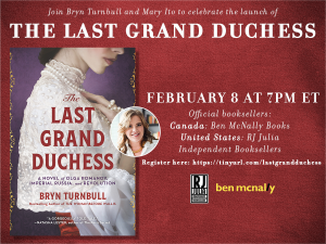 In partnership with Harper Collins Canada we will be the official booksellers for the launch of The Last Grand Duchess by Bryn Turnbull. The event will be hosted by Mary Ito. We hope you can join us! When: Tuesday, February 8, 7 p.m. Where: Online Only Registration is free, you can sign up here: https://tinyurl.com/lastgrandduchess