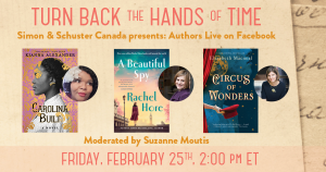 Simon and Schuster Canada is hosting a Facebook event featuring three historical fiction writers. Rachel Hore, author of A Beautiful Spy, Elizabeth Macneal, author of Circus of Wonders, and Kianna Alexander, author of Carolina Built, will all be participating in the conversation, which will be moderated by Suzanne Moutis. When: Friday, February 25, 2 p.m. Where: Facebook / Online Only Too, if you buy a copy of any of the author's books you can register to win all three books. More information is here: https://www.simonandschuster.ca/p/turn-back-hands-time-sweepstakes-2022/