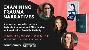 Our very own Danielle McNally will be moderating a conversation with authors Stéfanie Clermont and Elise Levine. They will be talking about trauma narratives in fiction. When: Wednesday March 30, 7 p.m. Where: Online Only Registration is through Facebook and/or Youtube. More information here: https://fb.me/e/1kwF0F66f