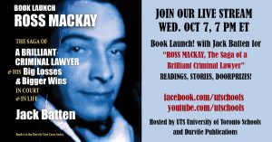 Join University of Toronto Schools and Durvile Publications for an online book launch to celebrate the release of Jack Batten's new book Ross Mackay, The Saga of a Brilliant Criminal Lawyer When: Wednesday, October 7 at 7pm Join the Livestream on Facebook or YouTube Ben McNally Books is the official bookseller for this event. Contact us today for a signed copy of Jack's new book. For people who love Perry Mason courtroom dramas and the criminal subculture of Better Call Saul, Ross Mackay, The Saga of a…