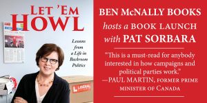 Please join Ben McNally Books and Nightwood Editions to celebrate the publication of Let 'Em Howl by Pat Sorbara. We'll have (plenty) of books for sale. Pat will be happy to sign copies, and will make some short remarks sometime after 6. When: Tuesday November 19 5:30 to 7:30 Where: Ben McNally Books 366 Bay Street This is a free event. You can RSVP on Eventbrite. Patricia Sorbara has been a political operative for more than forty years—a mainstay in…